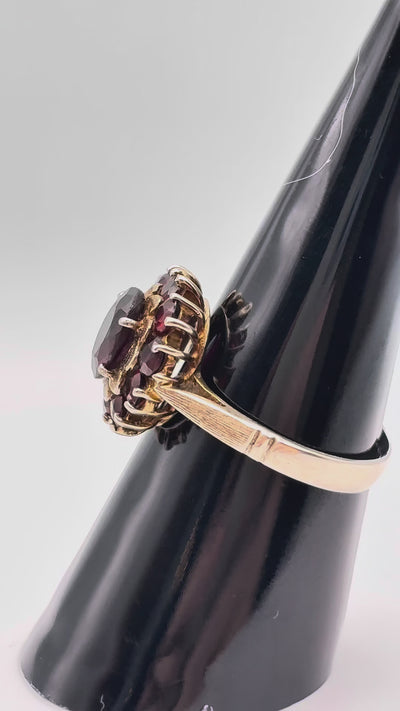 Ein zeitlos schönes Schmuckstück mit Geschichte: Dieser edle Vintage-Ring aus 333er (8 Karat) Gelbgold besticht durch sein florales Design mit funkelnden Granaten in Blumenform. Die warmen Rottöne der Steine harmonieren perfekt mit dem sanften Glanz des Goldes und verleihen dem Ring eine elegante, nostalgische Ausstrahlung.